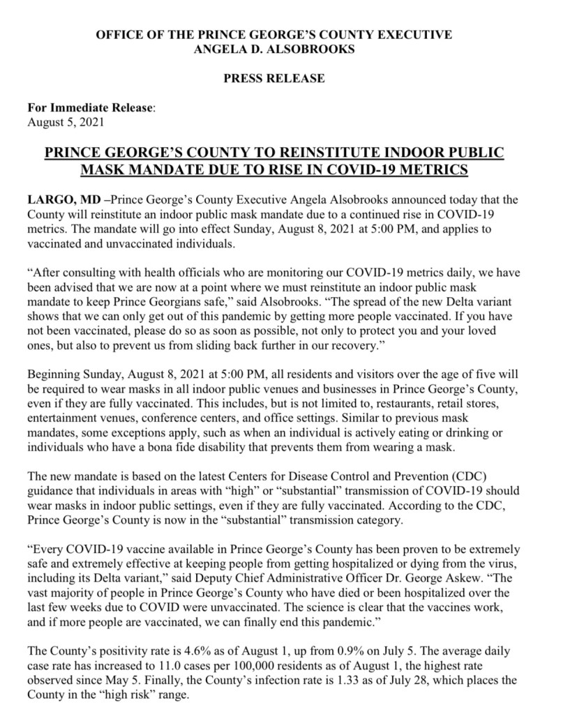 Mask Mandate Returns to PG County, MD- Effective 8/8/2021