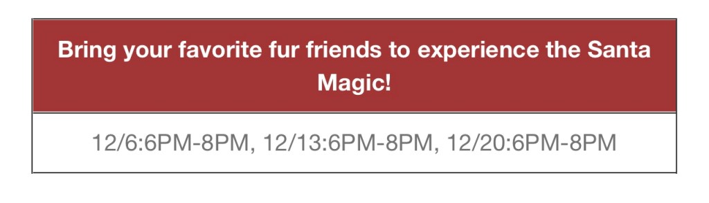 You can even bring your fur babies to take pics with Santa on certain dates/times: