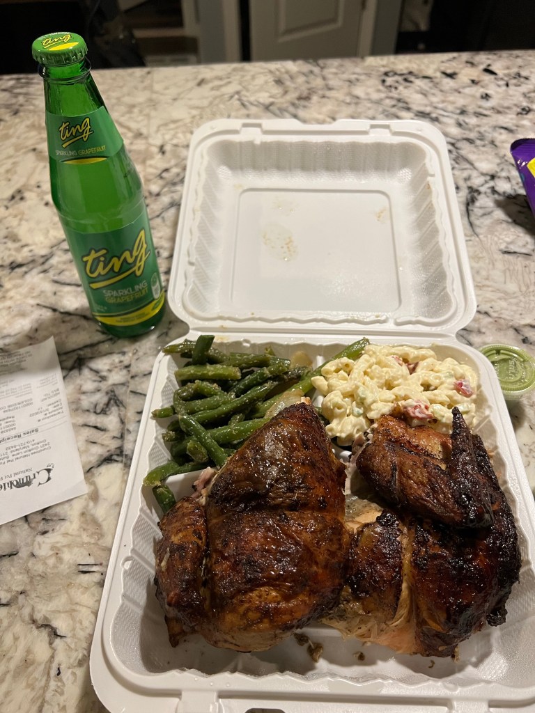 I really enjoyed the side items. The green beans were well cooked and seasoned. The pasta salad was light and tasty. However, the chicken was a little dry and bland.