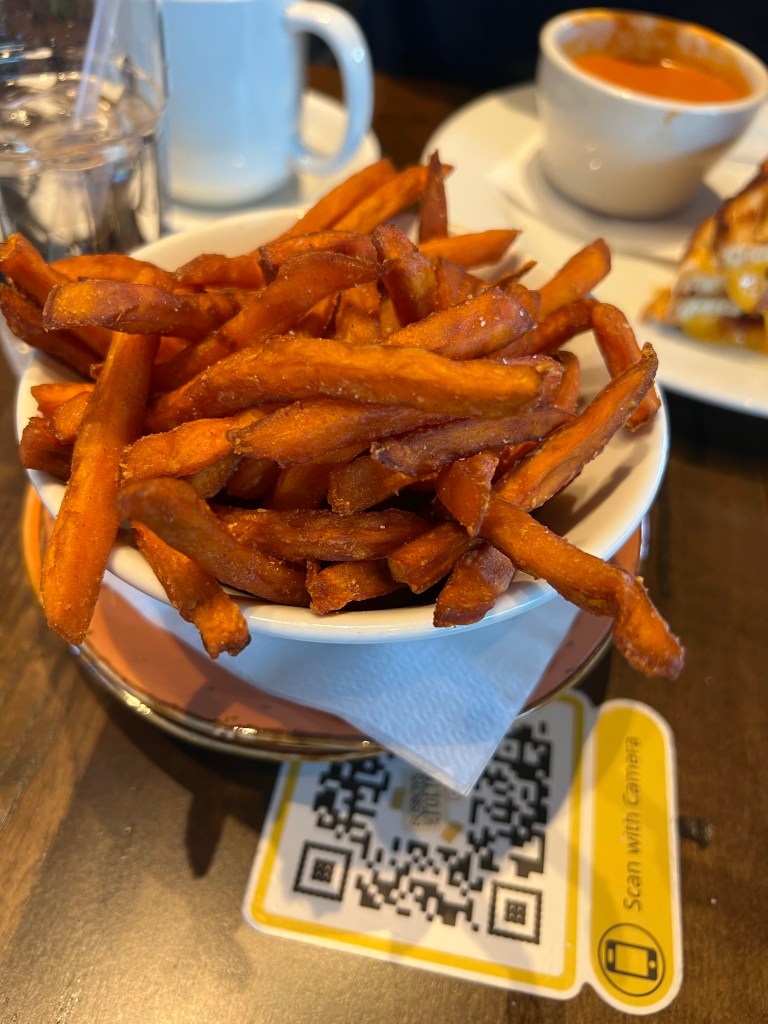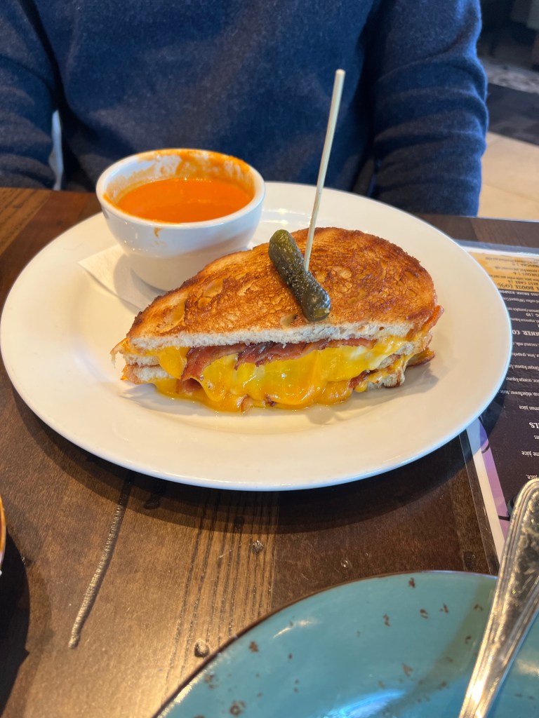 My husband ordered a grilled cheese sandwich with tomato soup and sweet potato fries. Which he really enjoyed.
