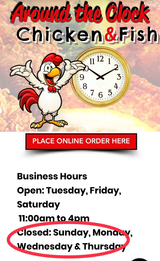 Be sure to check their business hours before you go! I find it ironic that they call themselves Around The Clock Chicken and Fish, but they are only open half of the week. π€¦πΎββοΈπ