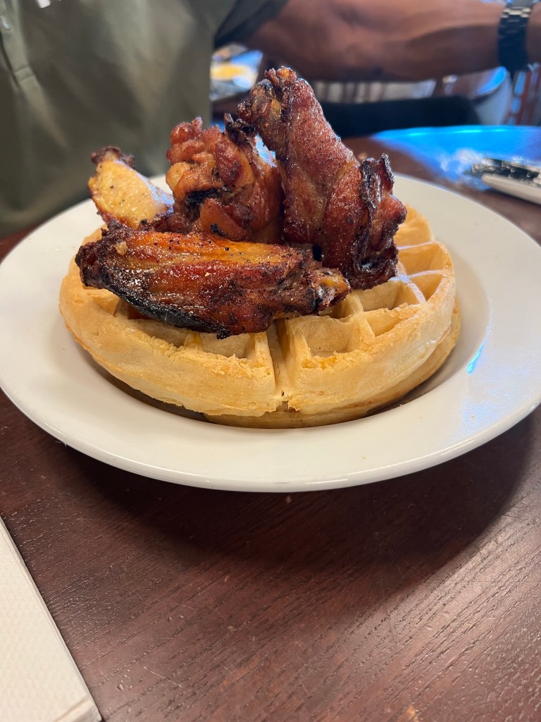 We ordered pancakes with a side of bacon and the chicken and waffles. The food arrived in sizable portions and actually tasted pretty good.